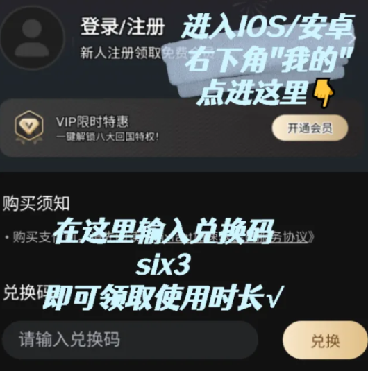 如果提示已过期或时长不够,小伙伴们则可以参照下图方法,输入兑换码six3获取限时免 /费使用时长: