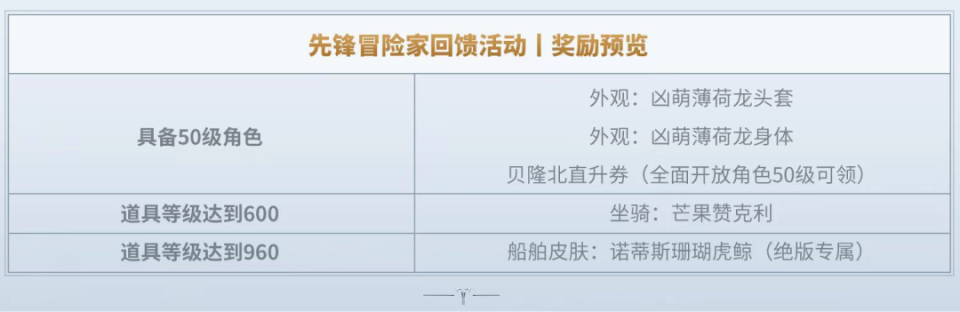 贝隆北直升券*1(为保障冒险家游戏体验和成长进度,该奖励需在全面开放服务器角色达到50级后方可领取)