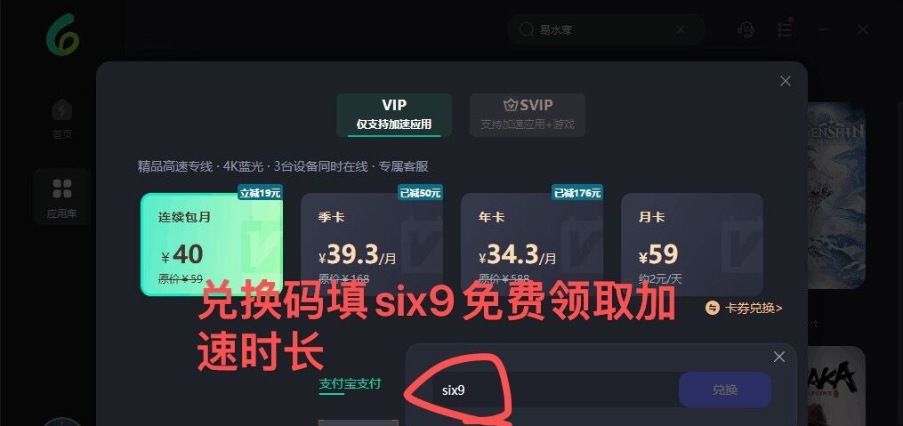 如果出现使 用 时 长 不够的情况,可以按照下图操作步骤使用兑 换 码 【six9】获取额外使 用 时 长。