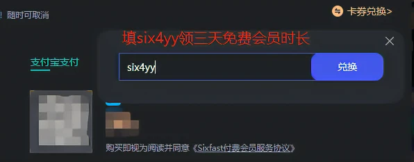 这里没有加速时长的玩家在Sixfast 左侧【会员充值】找到【卡券兑换】填【six4yy】,手机端用户可以在 Sixfast 【我的】中点击【立即续费】兑换码内填【six4yy】,或直接在Sixfast 官 网 注 册 登 录 后,在【个人中心】【兑换码】处填【six4yy】就能领取免费加速时长了