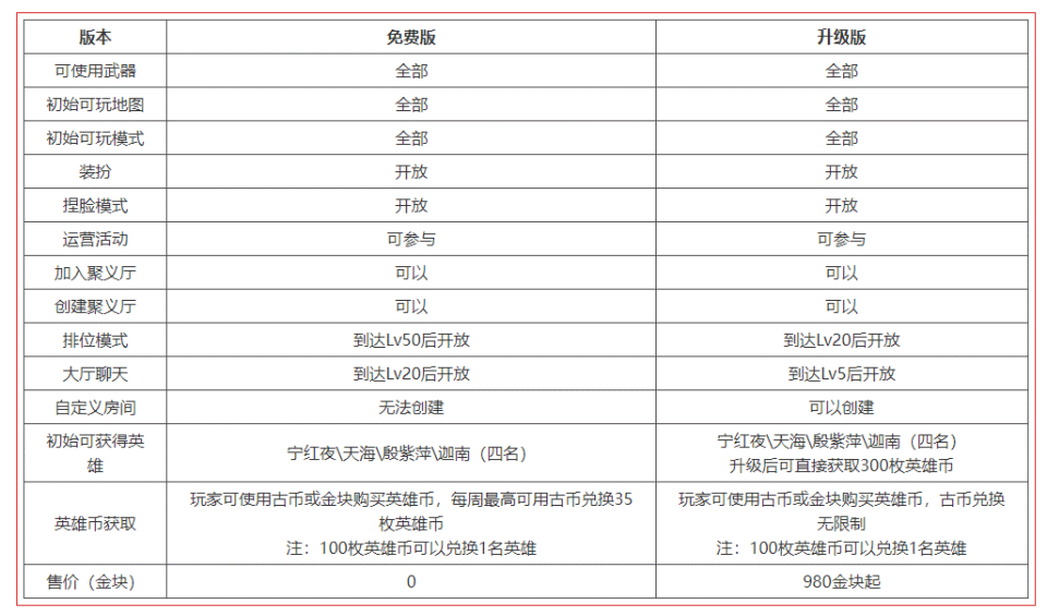 同时,免费进入游戏的玩家可在游戏内购买升级包,升级至三个版本(标准版/豪华版/终极版)。