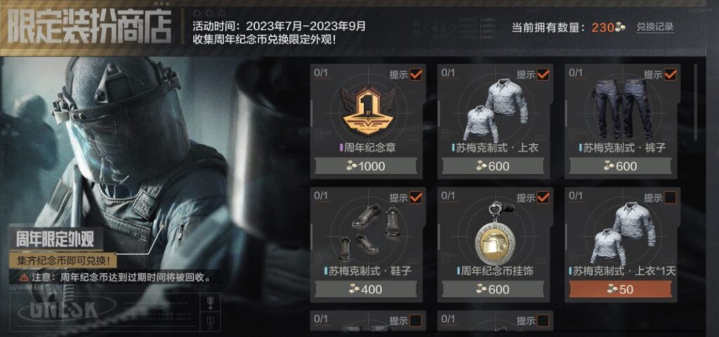 限定装扮商店开放期间,通过使用纪念币即可兑换永久周年庆限定外观,还能兑换【纪念币枪械挂件】、【周年庆纪念章】等限定物品!