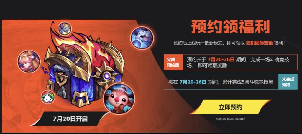 《英雄联盟》“斗魂竞技场”现已全面开张,7月20日至7月26日期间,参与竞技场预约,并完成一场斗魂竞技场,即可解锁随机图标宝箱(忘记预约的玩家也可以通过首周活跃获得!)参与全民武道馆系列活动,还可以免费获得更多宝箱福利!