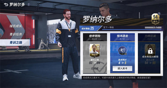 解锁后,玩家可通过积极完成【今日训练】、【赛季目标】等任务提高该青年球员的成长等级,成长等级可用来解锁【青训之路】关卡,完成对应关卡后即可提升该青年球员的潜力上限和技术特点等级,助其蜕变超级巨星,最终成长为96潜力的C罗、梅西。