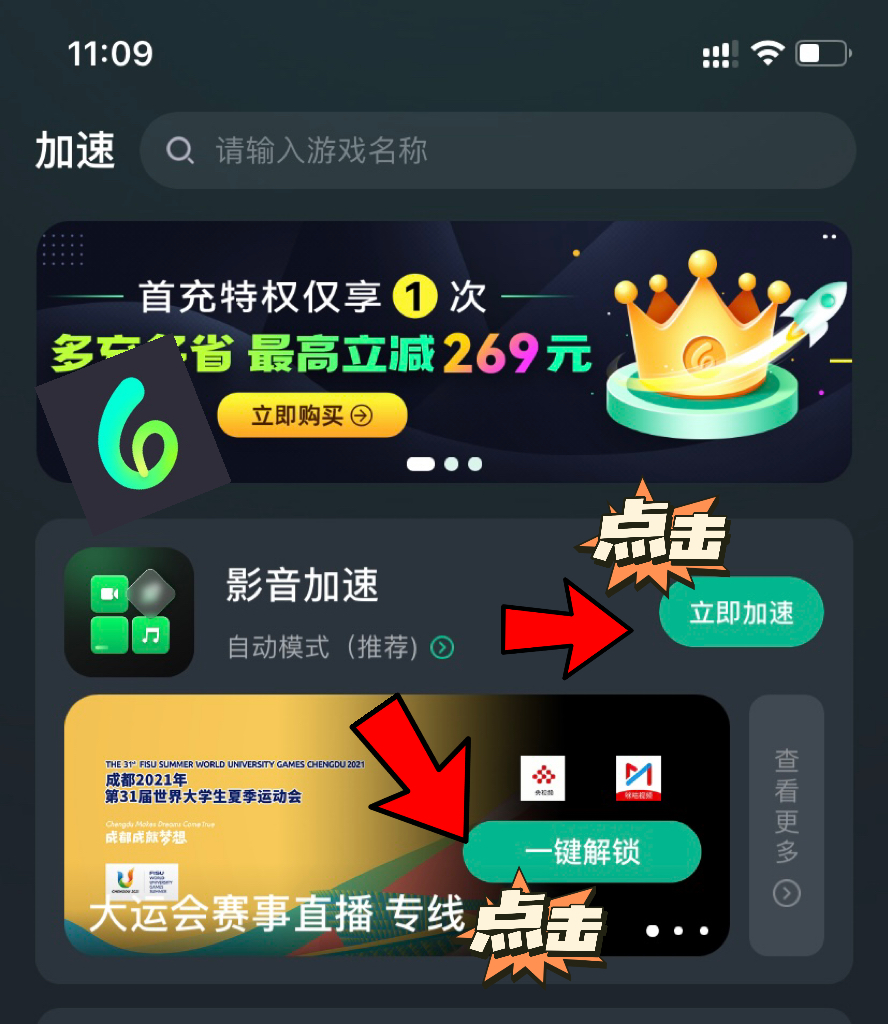海 ./外怎么观看成都大运会中文直播?可以使用Sixfast来观看!国外用户可以在各大软件商店或Sixfast官网下载安装,注册后搜索【影音加速】功能,点击加速即可。如果没有使用时长,请参照下图方法在兑换码处填入【six9】获取免费使用时长!