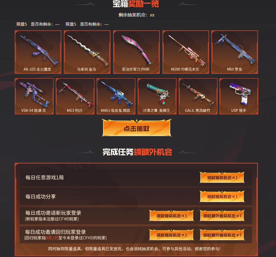 月初限时BUFF:9月2日00:00-9月3日23:59期间,完成任务获得翻倍抽奖机会!例如完成游戏1局任务,可获得2次抽奖机会