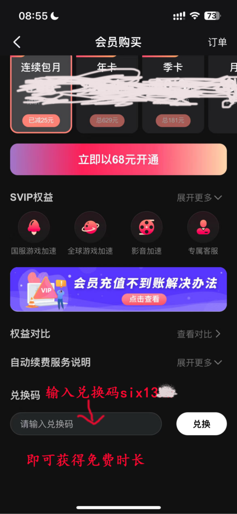 我们需要先注册登录,然后输入兑换码【six13】领取免费会员!