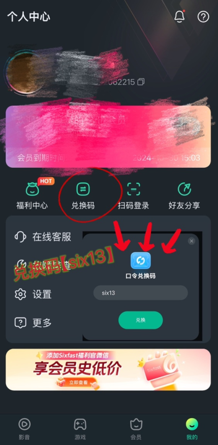 首先下载注册登录,然后使用兑换码【six13】兑换会员,最后选择对应的应用游戏。