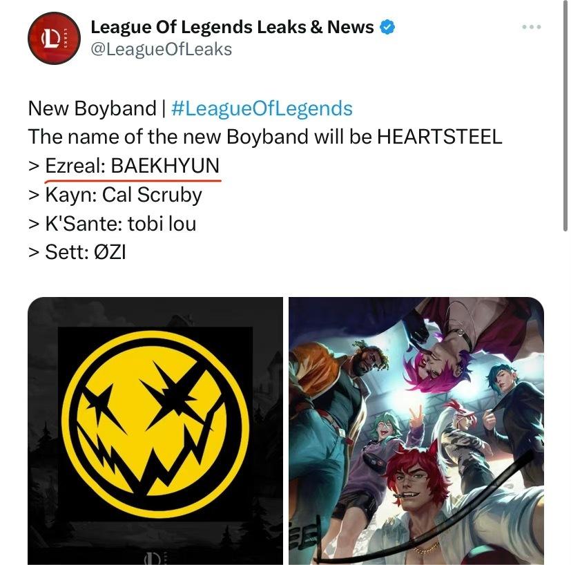 Twitter主Big Bad Bear在个人Twitter上爆料了LOL即将实装的乐队男团系列皮肤宣传图,下图分别为凯隐、厄斐琉斯、瑟提、永恩、伊泽瑞尔。最上方为奎桑提。