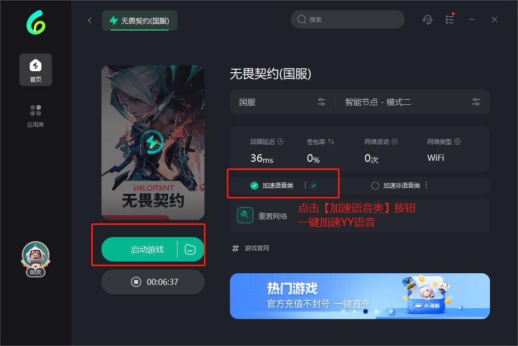 有的海外玩家想要玩无畏契约国服,但却发现游戏卡加载、进不去,或者在和队友玩游戏语音时经常掉线/声音小/有延迟,这个时候可以试试Sixfast,直接搜索找到无畏契约国服,开启加速就能解决高延迟、卡加载、进不去的问题。加速时点击【加速语音类】按钮即可一键加速YY语音,让海外玩家一边顺畅的玩游戏一边和队友语音。这里小猪告诉大家一个白嫖Sixfast的方法,一般人我可不告诉他嗷~电脑端的Sixfast的玩家,在左侧【会员充值】找到【卡券兑换】填【six9】就能免费使用软件了!手机端Sixfast的用户在【我的】—【立即缴费】——【卡券兑换】处填【six9】兑换后也能free使用哦!大家赶紧冲啊~一起薅秃Sixfast!