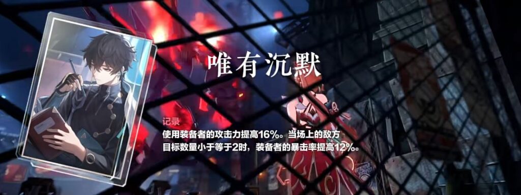 四星陪跑光锥,巡猎光锥,【唯有沉默】攻击力加成,敌方目标数量小于等于2时提高暴击率,因此强度会受敌方数量影响,但依旧算是与【论剑】相当的优质四星巡猎光锥。