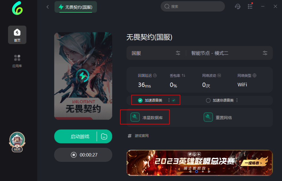 2.搜索找到无畏契约,根据自己的区服选择国服或者国际服,一键加速,即可有效减低延迟,勾选语音类加速可以防止卡麦(加速功能限海外用户),然后点击准星数据库,找到自己想要的准星。