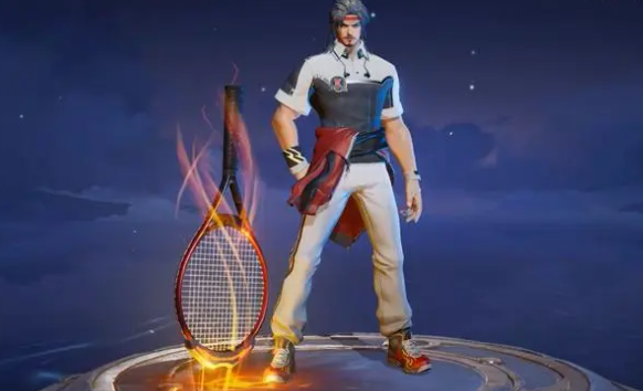 全新户外运动休闲形象,整体以黑、白、红的配色为主,他佩戴以老虎形象为印花的亮眼徽章,腰间随意的栓着红色的运动外套,火焰纹路装饰于服装的各处细节之中,武器创意化为酷炫、帅气的网球拍,曹操一手拿着网球拍,一手拿着网球,充满运动活力。