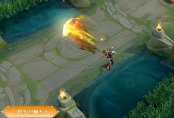 曹操施放第二技能时,他会挥动剑气向前方释放,剑气带有黄色和棕色的效果,随后逐渐消散。与此同时,地面上也会有石块向两侧飞溅。
