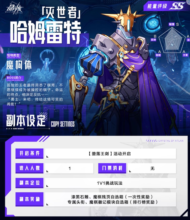 单人挑战「灭世者」哈姆雷特并完成挑战任务,赢取魔棋残页自选箱与漆黑石雕。