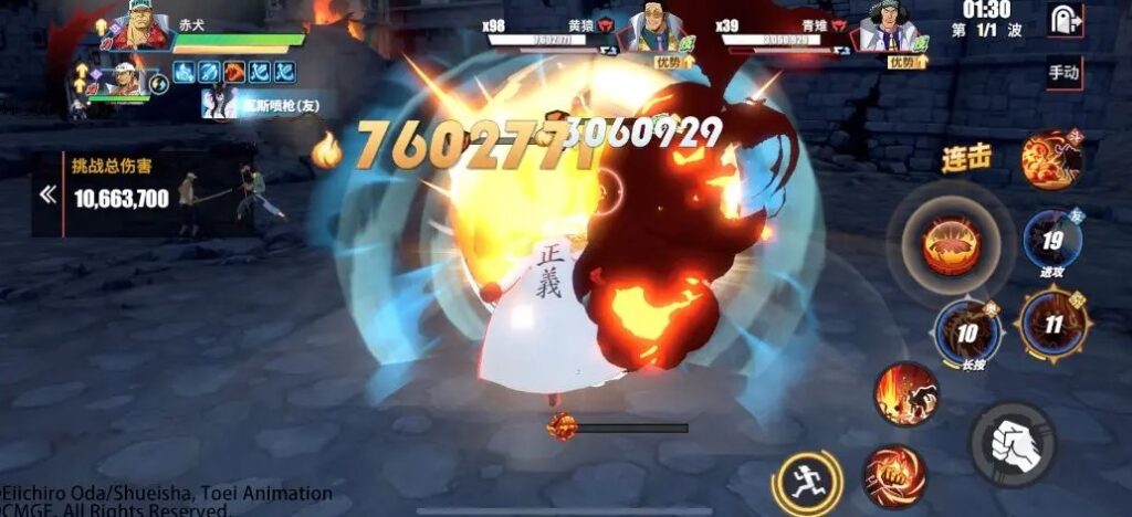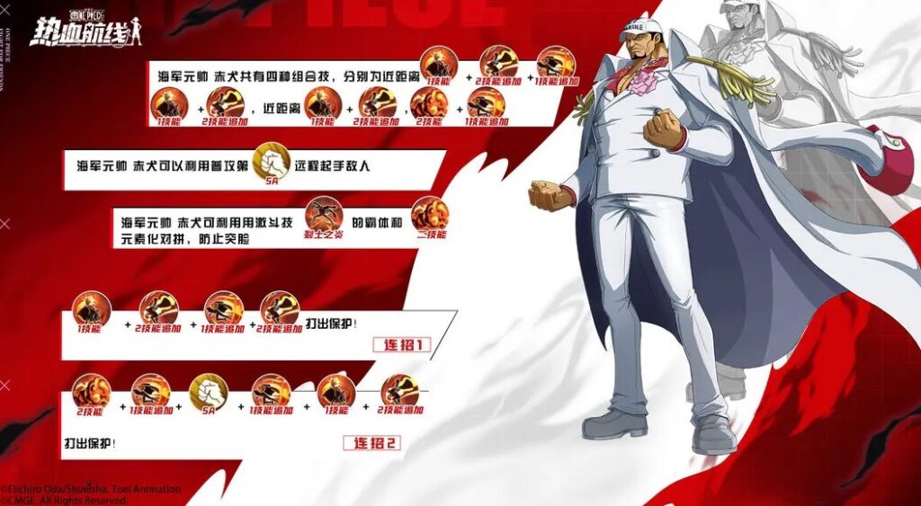 海军元帅 赤犬包含多种组合技,在PVE中,组合技形式包括三种: