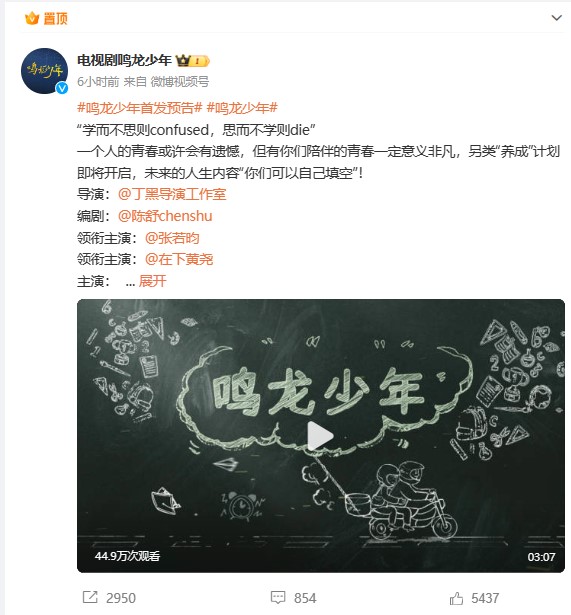 12月4日,张若昀和黄尧主演的电视剧《鸣龙少年》发布了首支预告。官方微博配文表示:“一个人的青春可能会有遗憾,但有你们陪伴的青春一定意义非凡。即将开启一项特殊的‘养成’计划,未来的人生故事‘你们可以自己填写’!”