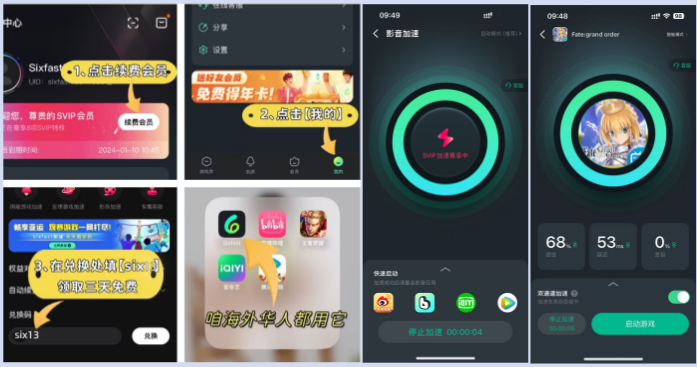 我们需要下载一个sixfast(六毫秒),下载注册登录后,输入对兑换码【six13yy】就能免费领取会员,然后选择影音加速后,就能打开软件或者网页正常观看了。(虎牙、BILIBILI、腾讯视频、爱奇艺、芒果TV、网易云、QQ影音、酷我、酷狗等等受限问题也能解决)