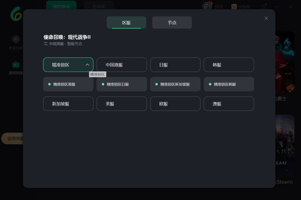 除了基本的加速功能外,sixfast还支持精确的锁定区域功能。因为COD20不支持手动选择区域,如果被随机分配到高延迟的地区,游戏体验将会非常糟糕。但是玩家们可以在海豚中选择精确的锁定区域节点来加速,这样就可以固定在想要进入的区域进行游戏,避免被分配到其他区域。