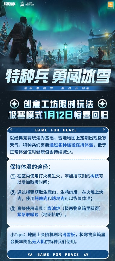 以经典竞赛玩法为基础,雪地地图上定期出现极寒天气,特种兵们需要通过各种途径保持体温,低于正常体温值时健康值会持续减少。