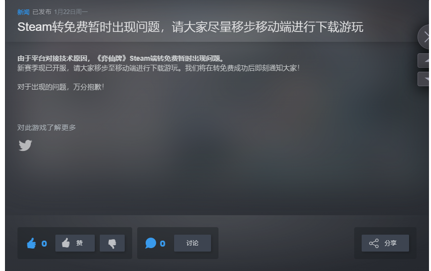PC端《弈仙牌》原定为今日转为免费游戏,但出现技术问题,可能将延后!