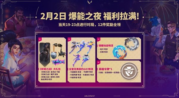 只要在2月2日当晚19点至23点进行一场对局(自定义和靶场除外),即可获得总计12件精美挂饰、喷漆、卡面和免费自选英雄的游戏道具!