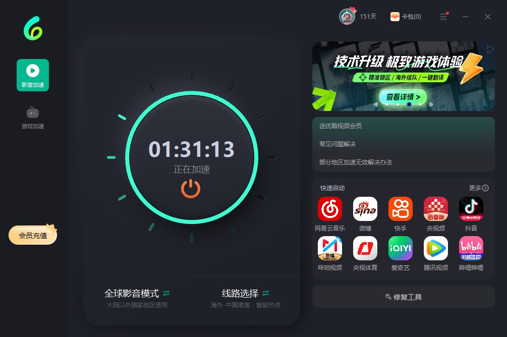 第三步:找到Sixfast的【影音加速】功能,点击加速即可解除央视频地区限制