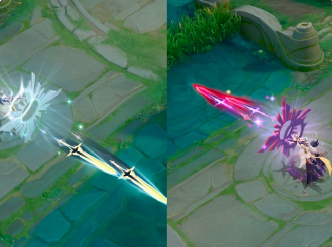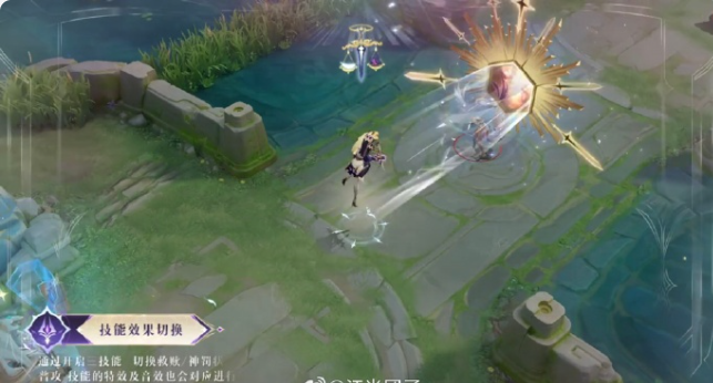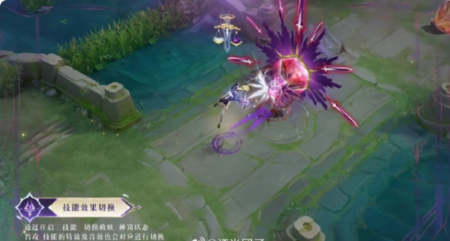三技能开启时,审判天平当空显现,出现分别对应救赎/神罚力量的全屏纹路特效,对敌人进行善恶审判并切换神剑的技能特效,带来不同视觉体验。