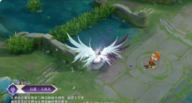 裁决女神飞至空中,同时展开象征救赎与神罚的硕大羽翼,飞羽飘舞,光芒四射