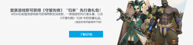 作为现有玩家,在6月24日凌晨2:00至12月6日14:59分前登录了游戏,即可获得先行者礼包。(包括在10月5日前登录《守望先锋》,或者在《守望先锋》“归来”正式上线后登录游戏)可以获得铁拳、黑影的皮肤,一款先行者头像,英雄雾子,以及未知惊喜礼物。