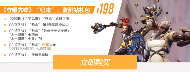 如果购买监测站礼包,能够获得2000枚“归来”中的金币(换算下来约为120人民币),一张免费的高级战令,两个英雄皮肤,以及典藏版守望先锋1代的内容。