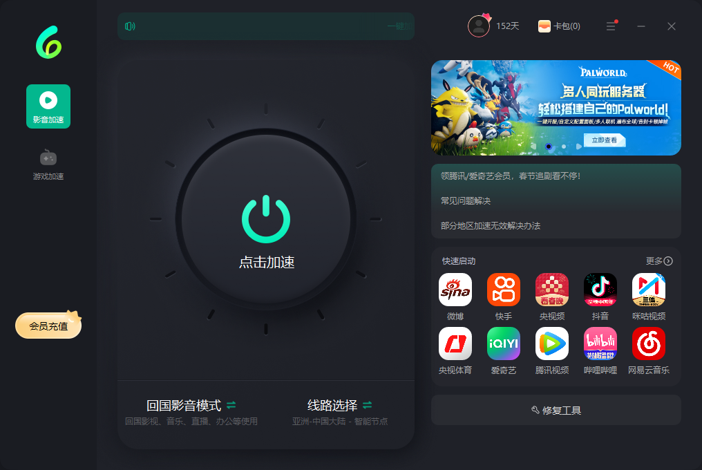 2、下载好后,打开Sixfast,在游戏库中找到【影音加速】,加速到100%就可以解决限制问题了,再重新打开芒果tv就可以了。没有加速时长的观众也不用担心,可以在Sixfast【我的】中点击【续费会员】兑换码内填【six4】,加速后就能流畅观看影音加速了!