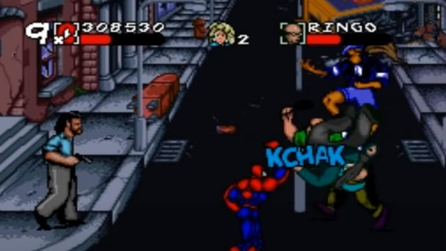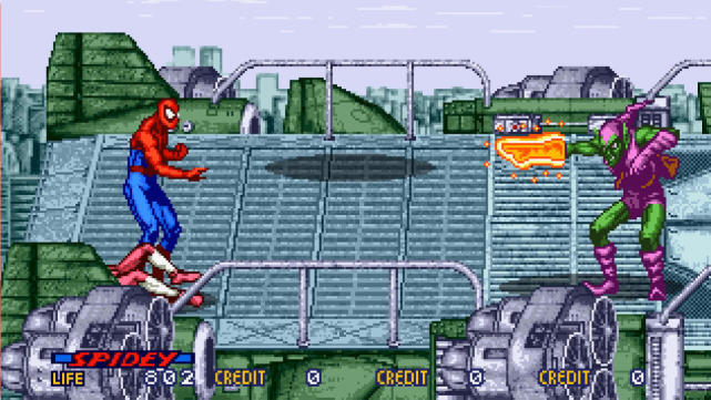 虽然世嘉的这款街机游戏以蜘蛛侠为主角,但它更像主机游戏。玩家需要在蜘蛛侠、黑猫、海底人和鹰眼中进行角色选择。蜘蛛侠和黑猫更注重近战,而鹰眼和水手则依赖远程攻击。