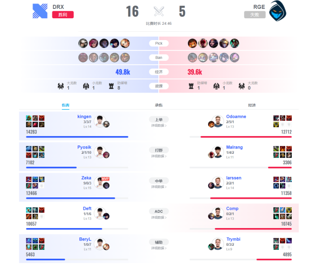 在小组赛收官战中,DRX很明显对于RGE研究了个遍:ban掉上路odoamne的混子英雄,抢下女警拉克丝的强对线组合,上半区的英雄选择主打一个节奏对碰,可以说是拿RGE最擅长的打法击败了RGE。