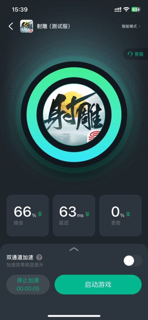 3、在Sixfast回国加速器内找到【射雕】,开启加速等待圆圈转到100%以后,重新打开游戏就能正常玩射雕手游了!