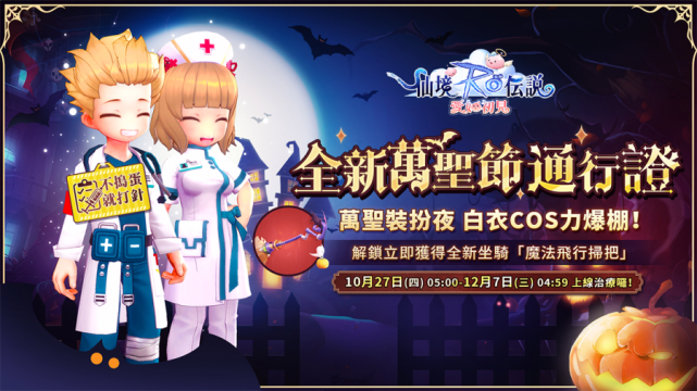 解锁全新万圣节通行证,可获得坐骑「魔法飞行扫把」及时装「医生cos 装」或「护士cos 装」等丰厚游戏道具。