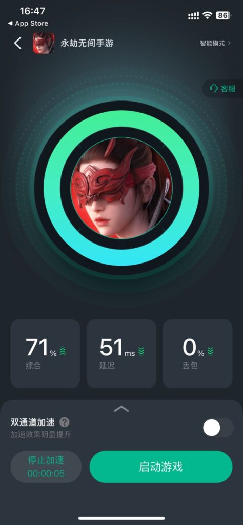 3、在Sixfast游戏库中找到【永劫无间手游】,加速到100%就可以解决限制的问题了,加速后重启重新打开软件就可以使用了~快去试试吧!