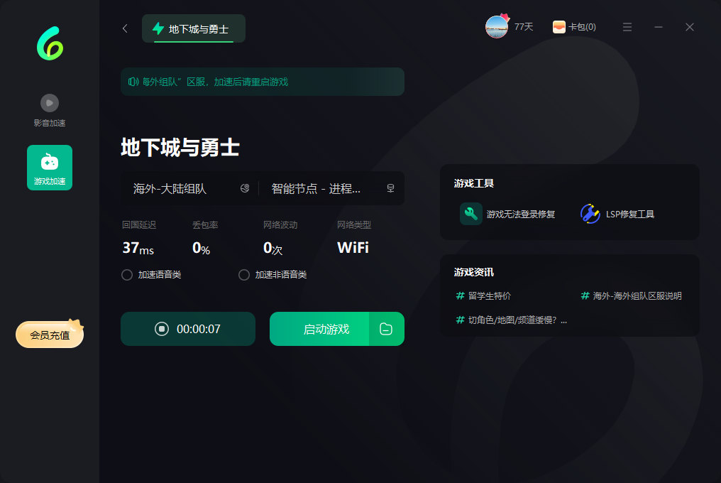 3、在Sixfast回国加速器内找到【DNF手游国服】,开启加速等待圆圈转到100%以后,重新打开QQ音乐就能正常和国内一样听歌了!快去试试吧!