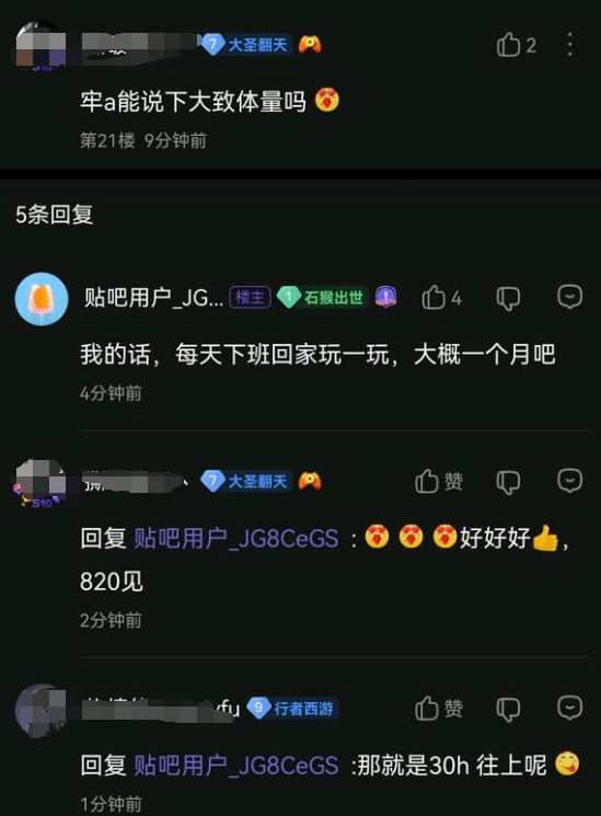 对于游戏体量的问题,他表示,自己每天下班玩一玩,大概一个月。