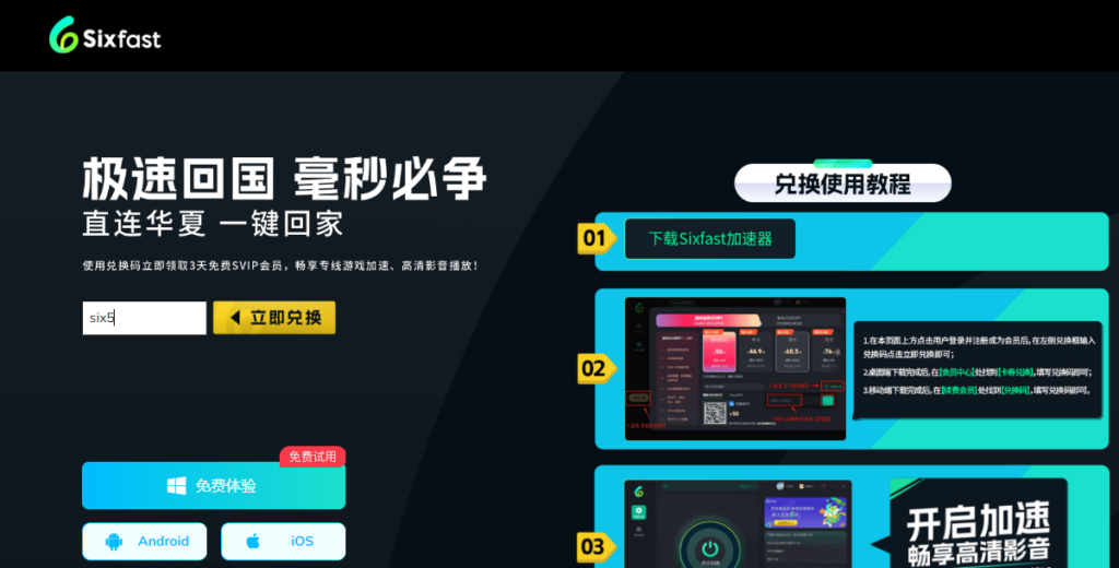 2、下载好后按照提示登录注册,在会员中找到【兑换码】,使用【six5】先领取时长,才能使用软件,也可以直接点击:https://www.sixfast.com/tg-exchange 按照下图所示填写兑换码【six5】,并按照右边步骤注册登录Sixfast,领取时长。(支持手机和电脑)