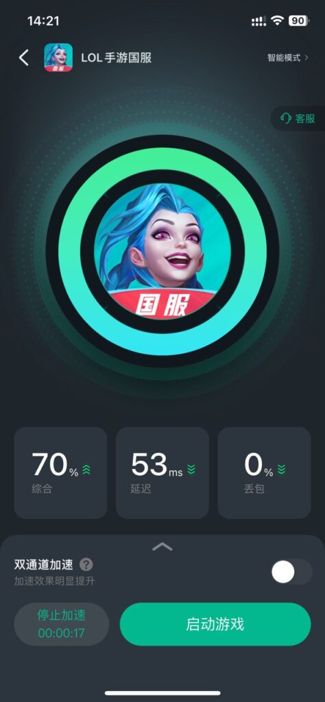 3、在Sixfast回国加速器内找到【LOL手游】,开启加速等待圆圈转到100%以后,重新打开游戏就能和国内玩家一起联机玩LOL手游了!