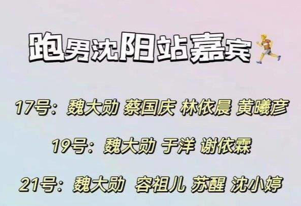 5月14日,《奔跑吧》节目组官宣下一站是沈阳,同时让人意外的是节目组居然一口气官宣了沈阳站的9位飞行嘉宾,包括魏大勋,蔡国庆,林依晨,黄曦彦,主持人于洋,谢依霖,容祖儿,苏醒,沈小婷。