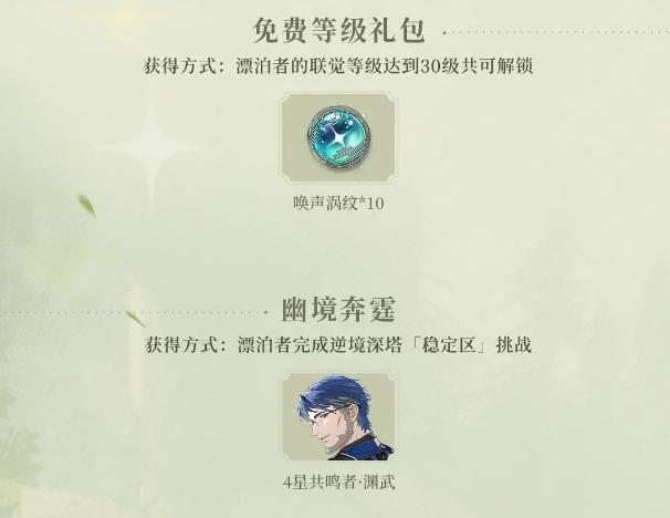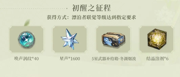 玩家可在游戏内累计免费获取84枚唤声涡纹、14枚浮金波纹、1800枚星声,以及自选5星武器、自选4星武器、羁旅印章·启程、4星共鸣者·散华、4星共鸣者·渊武等珍贵奖励。