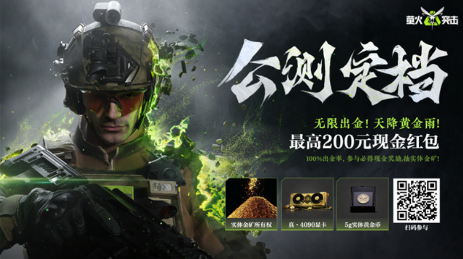 除端内持续进行的参与测试领取双份礼赠及最高达200%公测返利外,《萤火突击》公测定档追加福利抽送金矿。参与指定活动,即可领100%现金奖励!