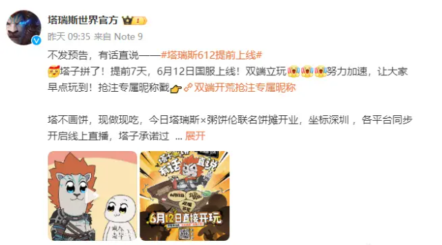 2024年6月6日上午9时21分,预约了塔瑞斯的玩家邮箱或是手机短信基本都收到了消息公众号也发布了相关推文,宣布原定2024年6月19号的上线时间提前啦,提前2024年6月12日上线,反向跳票就为抢在魔兽回归前上线。