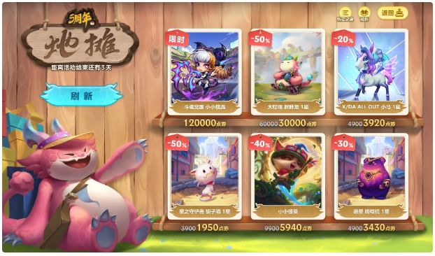 玩家首次进入“地摊”时,可揭晓6只小小英雄及对应折扣(部分神话级小小英雄无折扣),玩家可选择是否消耗点券解锁。“地摊”中会优先展示玩家当前大区未拥有的小小英雄,同一账号可在多个大区参与“地摊”活动。