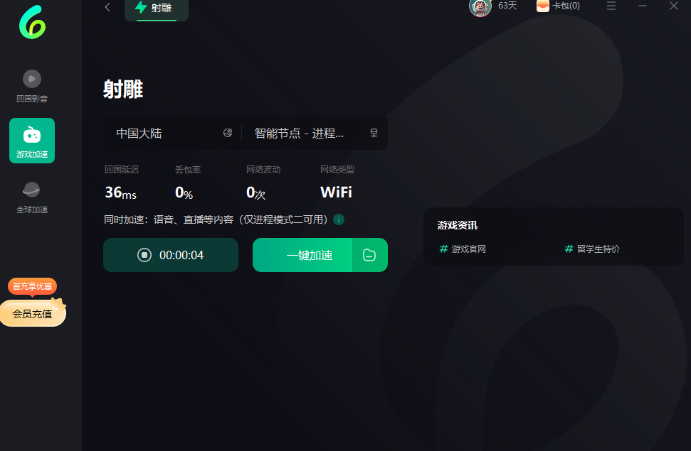 3、列如:在Sixfast回国加速器内找到【射雕】国服国际服都能正常加速,开启加速等待圆圈转到100%以后,再重启游戏就能极大程度降低延迟了!(其他游戏也是一样的操作)