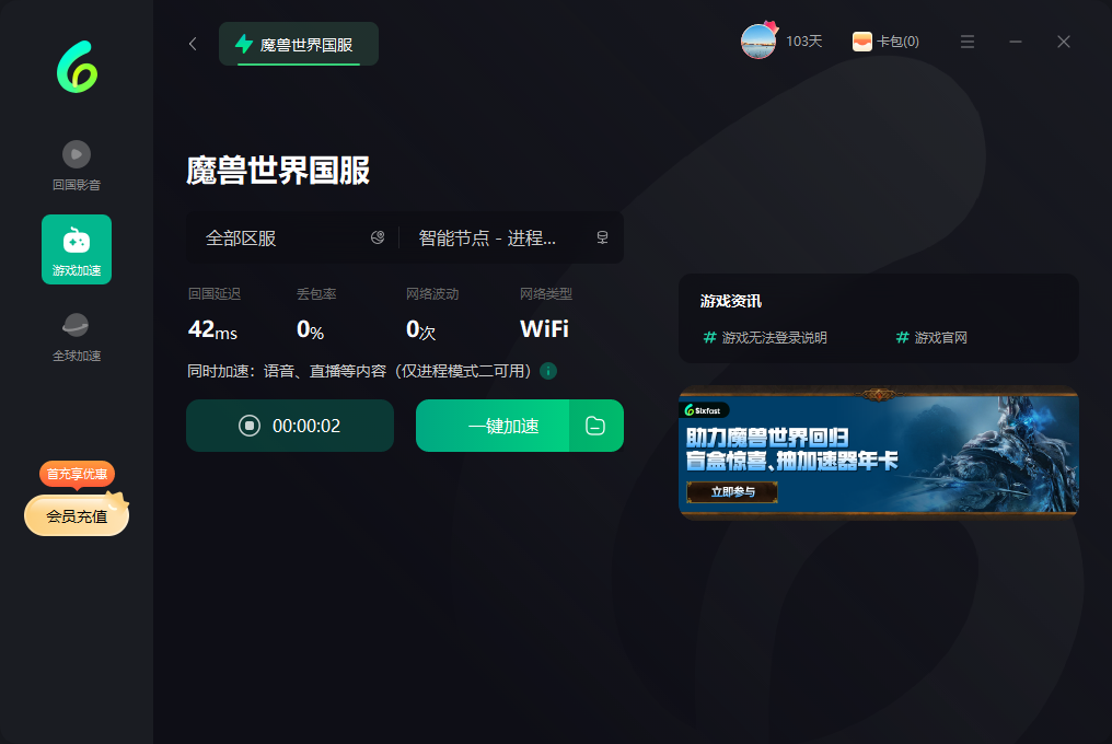 魔兽世界6月27日开服,国外想玩国服魔兽世界的玩家可以准备登录魔兽世界了!有卡顿延迟的情况的话,可以使用sixfast回国加速器一键加速!三天免费兑换码“six4”领取加速时长!