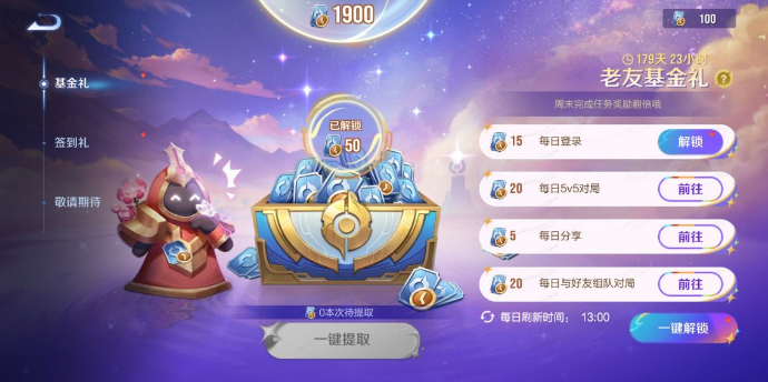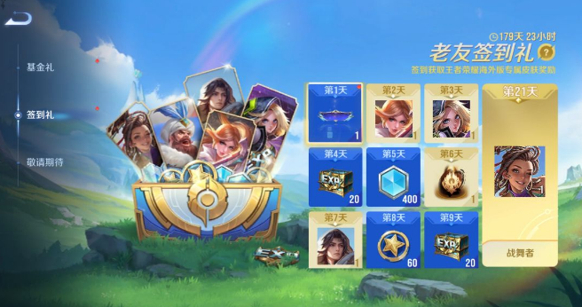 4.6月20日全球上线后会有0元购活动,用户30天最多获得30英雄/皮肤(皮肤是通过刷新随机刷的,每1-2天满活跃就有机会必定刷到珍贵商品,每周逐步晋级奖池。首周大概率英雄,小概率伴生皮与勇者皮。2周皮肤概率提升,加入勇者皮与史诗皮。3周进一步提升皮肤概率,加入极低概率传说皮。4周加入ip与限定皮肤)完成绑定后,可参与老友签到礼活动,领取英雄&皮肤&道具奖励