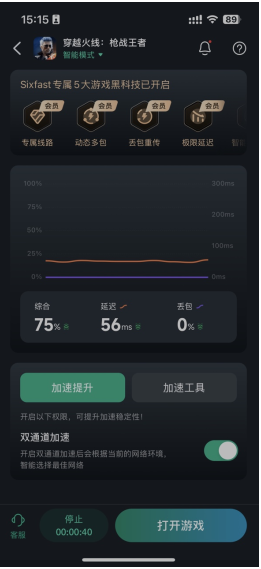3、列如:在Sixfast回国加速器内找到【穿越火线:枪战王者】国服国际服都能正常加速,开启加速等待圆圈转到100%以后,再重启游戏就能极大程度降低延迟了!(其他游戏也是一样的操作)